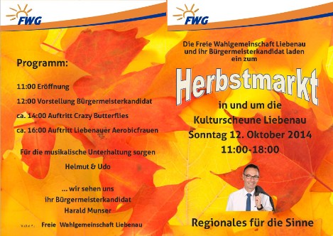 Der Herbstmarkt in der Liebenauer Kulturscheune wird ein echtes Highlight im Bürgermeisterwahlkamp in Liebenau. Veranstaltungen dieser Größe und Ausprügung sind nur möglich, wenn ein ganzes Team mit Engagement hinter der Sache und dem Kandidaten steht. Mit soe einem Team lässt sich nach einer erflogreichen Wahl definitiv etwas bewegen. Danke schon einmal von hier.